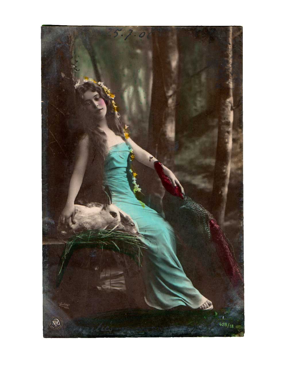 Cartes postale ancienne colorisée : scène bucolique avec l’actrice « Doll », et des lapins…